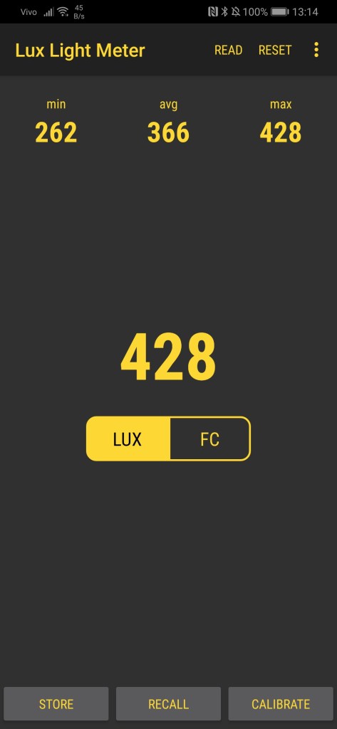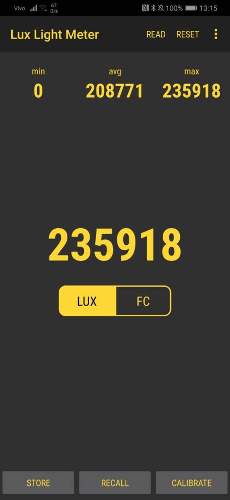 Por fim, peguei um App gratuito para medir a quantidade de luz de uma sala de escritório e em seguida medi a quantidade de luz do sol as 14:00 num dia de inverno. O sol, pelo menos para a câmera frontal do celular tem mais de 500 vezes a energia da sala de um escritório iluminada a LED e fluorescente , claro, esse ensaio não tem nenhum respaldo cientifico: